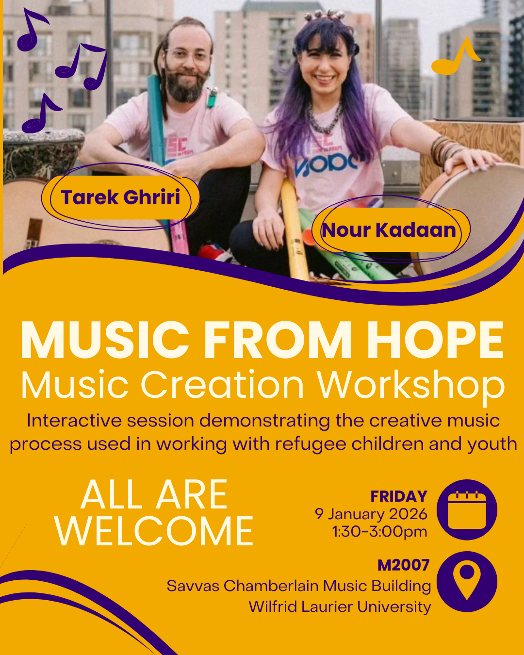LCMC is thrilled to host Tarek Ghriri and Nour Kadaan who will share music creation strategies they have developed in working with newly arrived refugee children and youth. The session will screen the microdocumentary on their organization Music from Hope, followed by a participatory music workshop and pedagogy debrief. All are welcome and no registration is required. This event is supported in part with funding from the Social Sciences and Humanities Research Council.