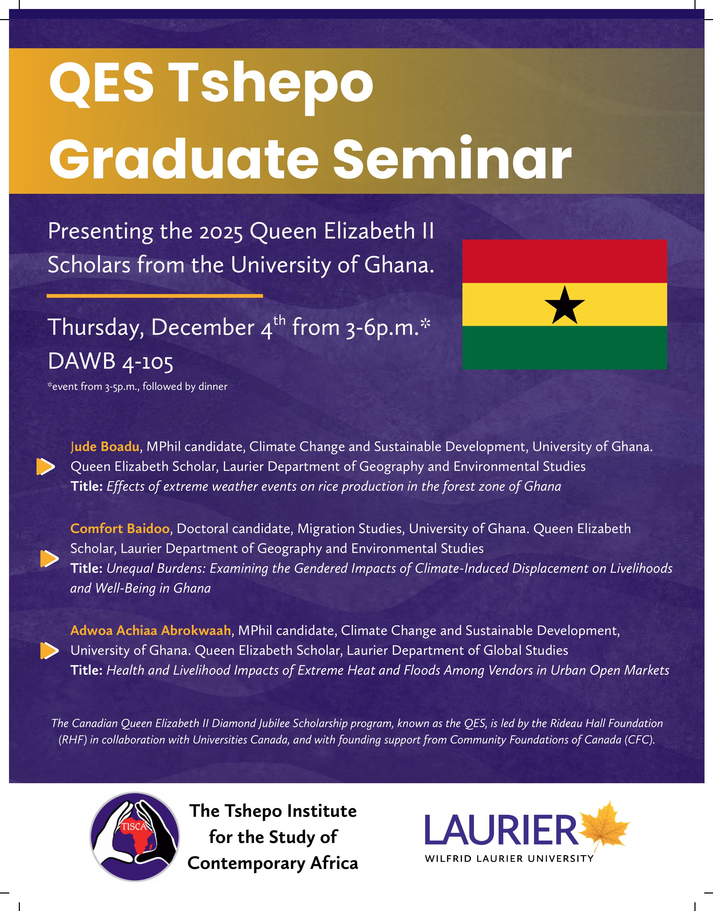 This is an event that celebrates our Laurier and UGhana Queen Elizabeth Scholarship recipients and also raises awareness for potential future Laurier QES scholarship students. If you know a student who might be interested in applying for the scholarship to fund participation in the 2026 Ghana internships, please pass along this information.