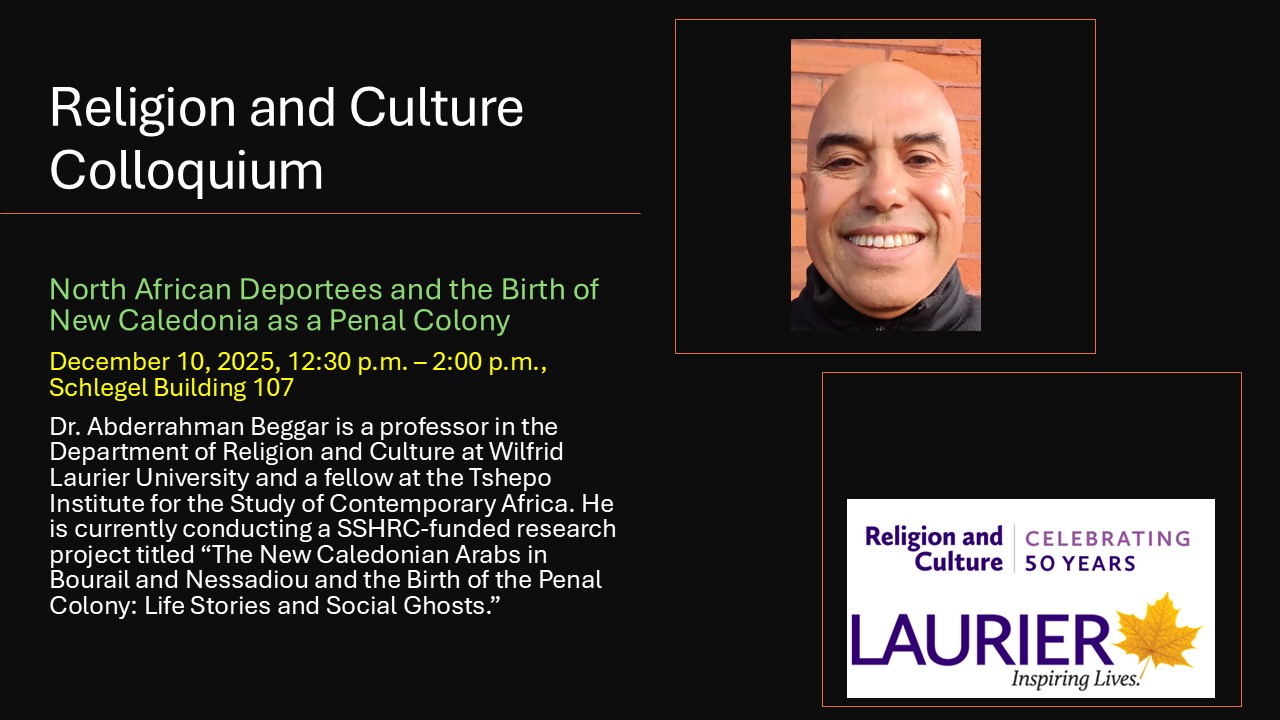 Tshepo Fellow, Dr. Abderrahman Beggar is a professor in the Department of Religion and Culture at Wilfrid Laurier University and a fellow at the Tshepo Institute for the Study of Contemporary Africa. He is currently conducting a SSHRC-funded research project titled “The New Caledonian Arabs in Bourail and Nessadiou and the Birth of the Penal Colony: Life Stories and Social Ghosts.”